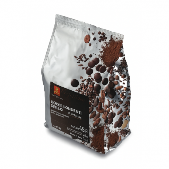 カカオの風味がしっかりしたチョコチップ。カカオ分45%ですが、クッキーやパンなどに入れ焼いた時、だれないようカカオバター分を少なめに配合しています。その分カカオマスが多いのでパンチの効いた味わいです。